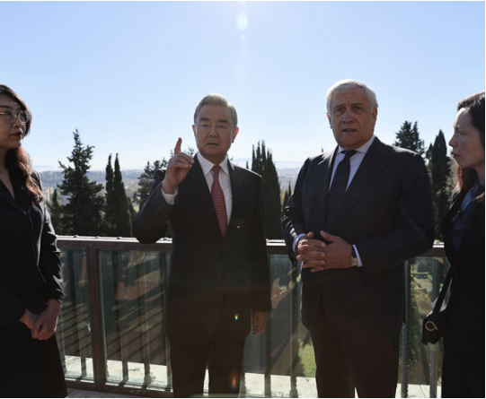2025-10-10当地时间2025年10月8日,中共中央政治局委员、外交部长王毅在罗马同意大利副总理兼外长塔亚尼举行会...